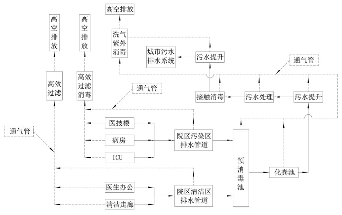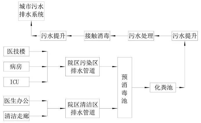 污染區(qū)的污廢水與清潔區(qū)污廢水分流排放,且污廢水應(yīng)各自獨立排到預(yù)消毒池。生活排水流程如圖4。