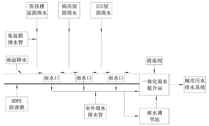 室外雨水應(yīng)采用管道系統(tǒng)排水,不采用地面徑流或明溝方式排放。采用地面徑流或明溝排放,一旦被新型冠狀病毒污染,易再次通過室外雨水排水?dāng)U散病毒,接觸到易感人群,增加導(dǎo)致新型冠狀病毒感染的肺炎暴發(fā)或流行的風(fēng)險,因此火神山醫(yī)院設(shè)了單獨的雨水排水管道系統(tǒng)。