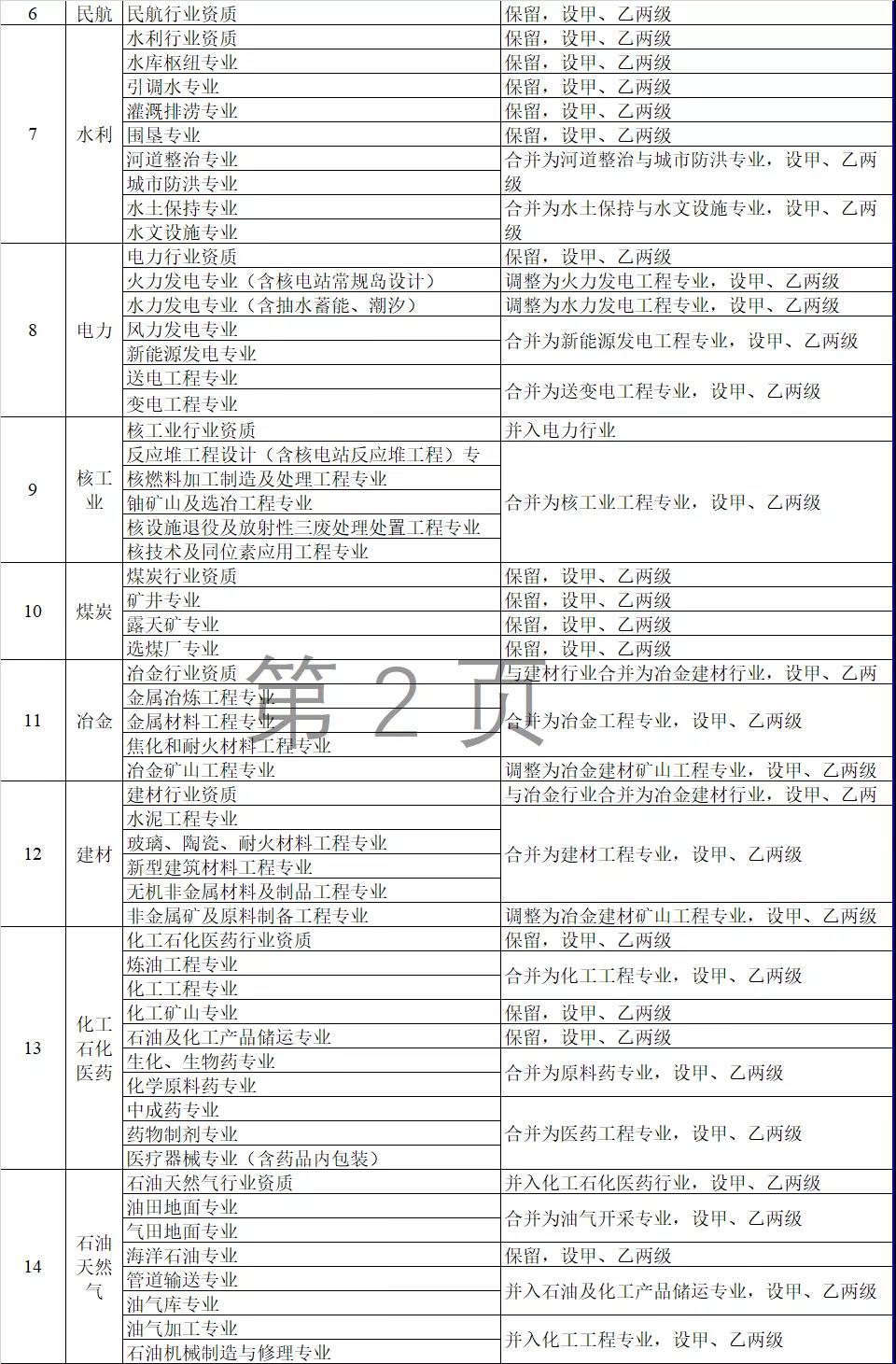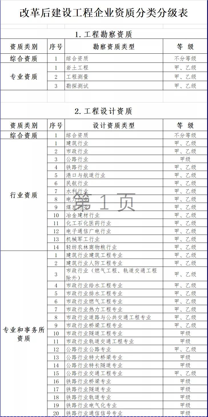 2.工程設計資質。保留綜合資質;將21類行業資質整合為14類行業資質;將151類專業資質、8類專項資質、3類事務所資質整合為70類專業和事務所資質。綜合資質、事務所資質不分等級;行業資質、專業資質等級原則上壓減為甲、乙兩級(部分資質只設甲級)。