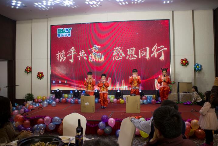 晚餐和文藝節目同時進行,舞蹈《C哩C哩》拉開晚會序幕,銀江吉祥寶寶如意也閃亮登場。隨后,歌曲、彈唱、藏舞、合唱、三句半、魔術、游戲、抽獎、優秀員工頒獎等穿插進行。