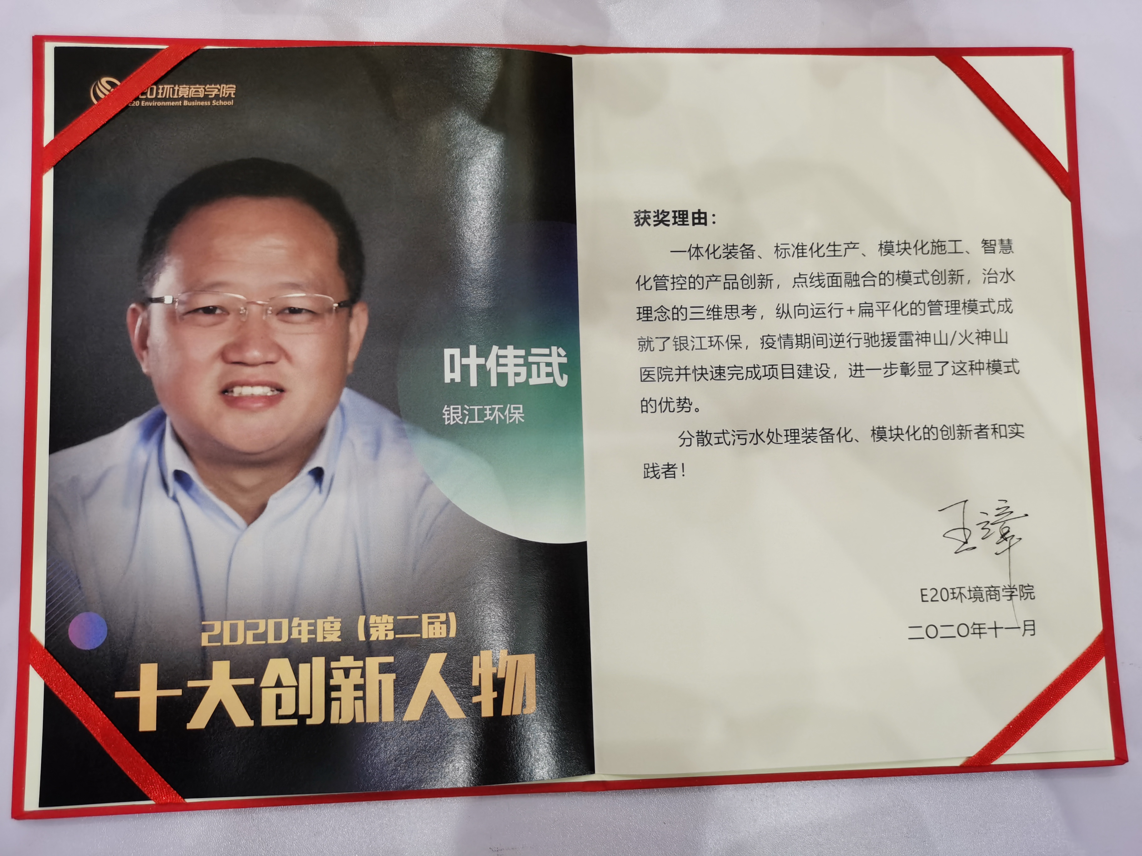 感恩年會上進行了E20環境商學院2020年度(第二屆)創新人物榜單揭曉與頒獎。銀江環保董事長葉偉武憑借“產品創新、模式創新”贏取超高人氣,現場捧回“十大創新人物”、“創新分享獎”、“最佳人氣獎”三大獎項。