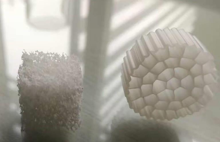 微生物賴以棲息的新型載體研制開發(fā)是移動生物膜法處理廢水的關(guān)鍵技術(shù)之一,其性能直接影響著污水的處理效果和投資費用。科研工作者以改進填料為突破口,不斷推動移動生物膜法的發(fā)展。目前的懸浮填料大多是由聚乙烯、聚丙烯及其改性材料、聚氨酯泡沫體等制成的,比重接近于水,長了生物膜以后,在正常的曝氣強度下極易達到全池流化翻動。懸浮填料的形狀通常為球狀、立方體、圓筒狀或粒狀,一般認為球狀有良好的水力學特性,是最理想的形狀。但受到生產(chǎn)技術(shù)的限制,材料作成球狀很困難;而圓筒狀填料當其長徑比為1時接近于球狀,因此PE懸浮填料一般選擇圓筒狀。聚氨酯懸浮填料依靠切割工藝,因此聚氨酯海綿填料選擇正方體。一般來說,國內(nèi)使用的載體外形尺寸比國外的要大,這主要是受整個工藝和出水格柵的限制,特別是國內(nèi)進水復(fù)雜,預(yù)處理不到位,水質(zhì)水量波動大等因素影響。(下圖左邊為親水性聚氨酯懸浮填料,右邊為HDPE懸浮填料)