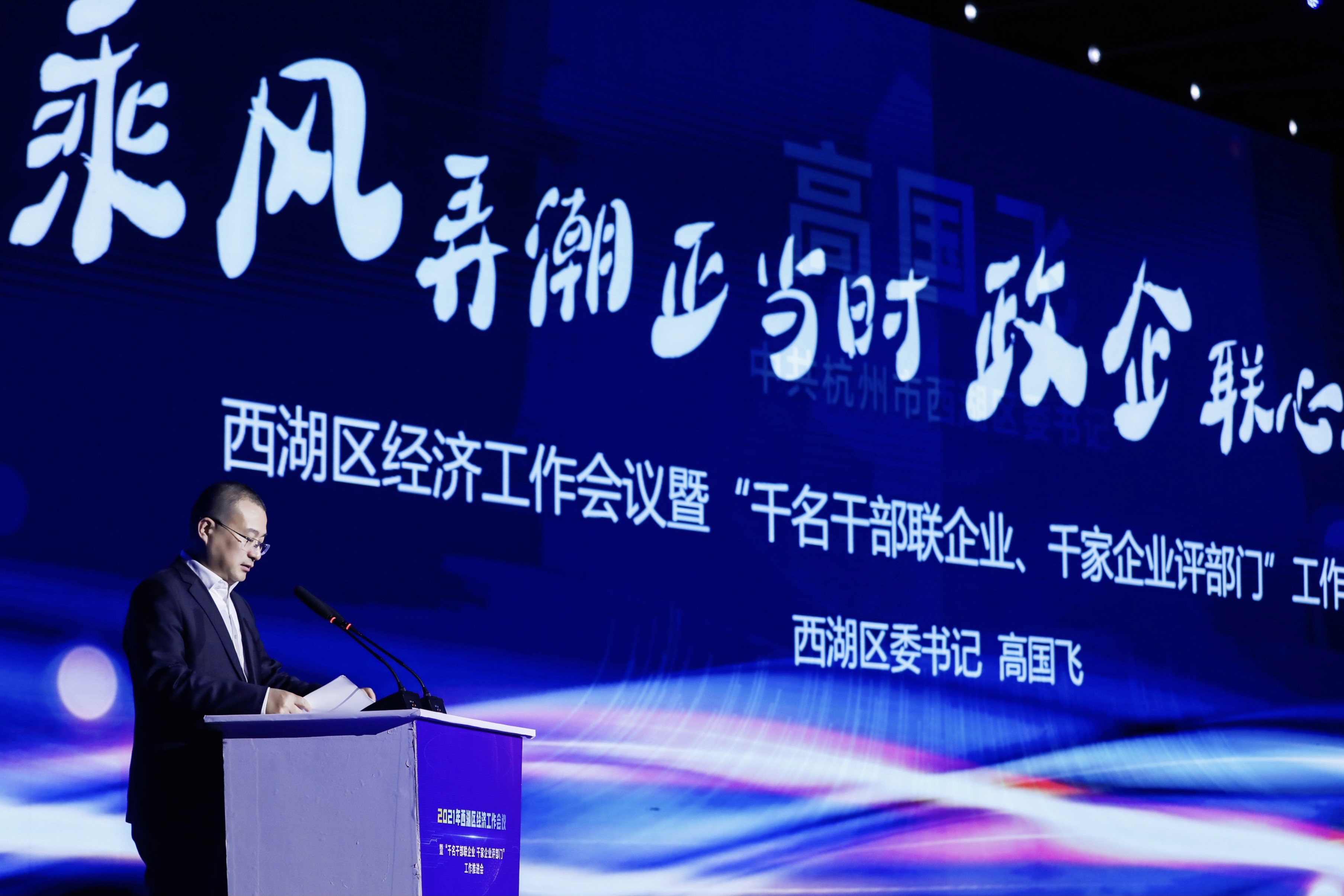 2021年西湖區經濟工作會議暨“千名干部聯企業、千家企業評部門”工作推進會在云棲小鎮國際會展中心一期二樓云棲廳召開。會議由區委副書記、區長董毓民主持,全區各單位和聯企干部以及雙千企業主要負責人參加。