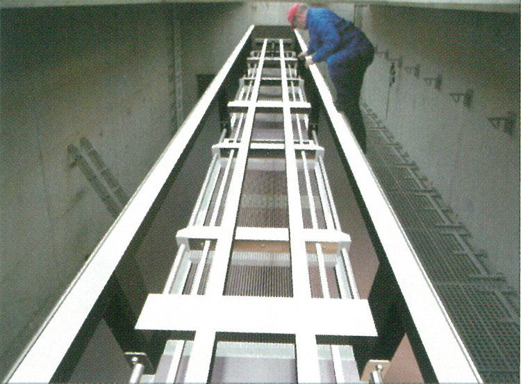 平板細(xì)格柵采用模塊化設(shè)計(jì),可通過較小的安裝口(6。0mm)安裝。模塊的最小寬度是40cm,但可以以10cm的長(zhǎng)度逐步加寬;模塊最小長(zhǎng)度為1 5m,可以以75cm的長(zhǎng)度逐步加長(zhǎng);格柵高度(包括水力驅(qū)動(dòng)器)組裝后尺寸小于30cm。細(xì)桿間距標(biāo)準(zhǔn)值為4mm,這時(shí)清洗效果最好,也可提供細(xì)桿間距為6、8、10或12mm的產(chǎn)品。